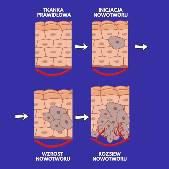 Nowotwór powstaje, gdy pojedyncza komórka w zdrowej tkance ulega zmianom genetycznym i/lub epigenetycznym, które zaburzają jej prawidłową kontrolę wzrostu. Zamiast przestać się dzielić lub ulec zaprogramowanej śmierci, taka komórka zaczyna niekontrolowanie się namnażać, tworząc skupisko nieprawidłowych komórek. W miarę wzrostu guza komórki nowotworowe potrafią pobudzać rozwój nowych naczyń krwionośnych (angiogenezę), aby zapewnić sobie tlen i substancje odżywcze. Dzięki temu guz nie tylko rośnie, ale także zyskuje możliwość rozsiewania się do innych części organizmu.