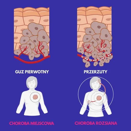 Największym zagrożeniem w chorobie nowotworowej jest jej zdolność do rozsiewania się, czyli tworzenia przerzutów. Komórki nowotworowe z guza pierwotnego mogą oderwać się od macierzystej tkanki, przedostać się do naczyń krwionośnych lub limfatycznych i wraz z krążeniem dotrzeć do odległych narządów. Tam mogą osiedlić się i utworzyć nowe ogniska choroby. Podczas gdy guz pierwotny jest zmianą miejscową, przerzuty oznaczają uogólnioną postać choroby, znacznie trudniejszą w leczeniu i odpowiedzialną za większość zgonów onkologicznych.