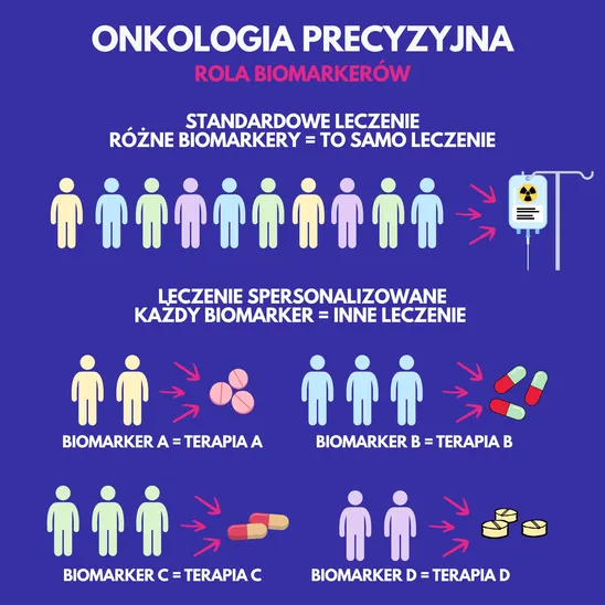 Współczesna onkologia coraz częściej odchodzi od podejścia „jedno leczenie dla wszystkich” na rzecz terapii dopasowanych do konkretnego pacjenta. Kluczową rolę odgrywają w tym markery nowotworowe – cechy biologiczne, które można zmierzyć w komórkach nowotworowych lub we krwi pacjenta. Markerem może być np. mutacja w genie, nadekspresja określonego genu, obecność cząsteczek lub komórek takich jak krążące komórki nowotworowe (ang. circulating tumor cells, CTCs). Dzięki markerom lekarze mogą lepiej diagnozować nowotwory, przewidywać ich przebieg oraz wybierać terapie ukierunkowane na konkretne mechanizmy molekularne. To sprawia, że leczenie staje się bardziej skuteczne i mniej obciążające dla pacjenta.