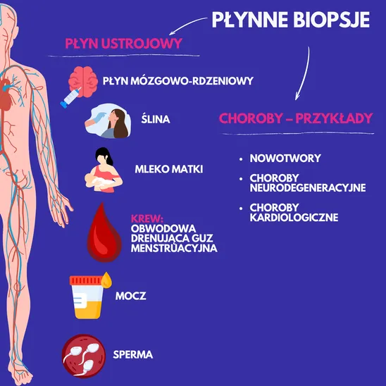 Płynna biopsja to innowacyjna metoda diagnostyczna, w której analizuje się materiał biologiczny obecny w płynach ustrojowych – nie tylko we krwi, ale również w płynie mózgowo-rdzeniowym, ślinie, mleku, moczu czy nasieniu. Dzięki nowoczesnym technologiom możliwe jest wykrywanie w nich fragmentów DNA, RNA, białek lub nawet komórek uwalnianych z guzów lub pochodzących z innych schorzeń. Biopsja płynna znajduje zastosowanie nie tylko w onkologii, ale także w diagnostyce chorób neurodegeneracyjnych i kardiologicznych. Jej największą zaletą jest minimalna inwazyjność i możliwość wielokrotnego powtarzania badań, co umożliwia monitorowanie chorób w czasie rzeczywistym.