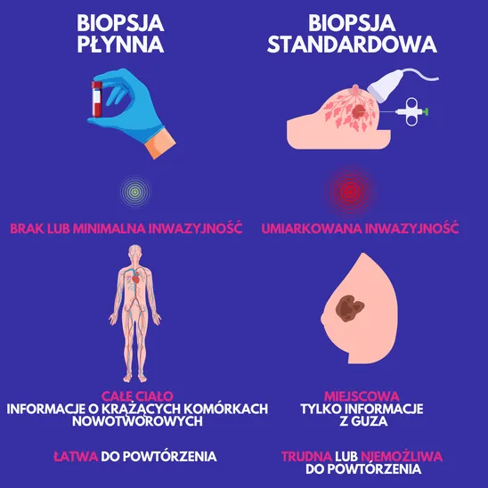 Tradycyjna biopsja polega na pobraniu fragmentu tkanki guza w celu analizy histologicznej i molekularnej. Choć dostarcza cennych informacji, jest zabiegiem umiarkowanie inwazyjnym, obarczonym ryzykiem powikłań i trudnym lub nawet niemożliwym do powtórzenia. Płynna biopsja to nowoczesna metoda, w której analizuje się materiał nowotworowy krążący we krwi - takie jak wolne fragmenty DNA, RNA czy krążące komórki nowotworowe (ang. circulating tumor cells, CTCs). Jest ona minimalnie inwazyjna, może być wykonywana wielokrotnie i dostarcza informacji o całej chorobie, a nie tylko o fragmencie guza. Dzięki temu staje się coraz ważniejszym narzędziem w diagnostyce i monitorowaniu nowotworów.