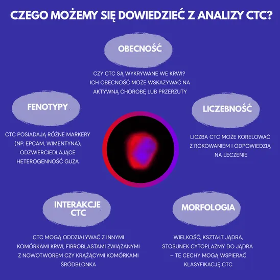 Krążące komórki nowotworowe (ang., circulating tumor cells, CTCs) to źródło niezwykle bogatych informacji o biologii nowotworu. Ich obecność i liczba we krwi może świadczyć o aktywnej chorobie lub ryzyku przerzutów oraz korelować z rokowaniem i odpowiedzią na leczenie. CTC wykazują różnorodne fenotypy, odzwierciedlające heterogenność guza, a ponadto mogą wchodzić w interakcje z innymi komórkami krwi, co może sprzyjać ich przeżyciu i rozsiewowi. Analiza ich morfologii - np. wielkości jądra, kształtu komórki czy stosunku cytoplazmy do jądra – może poprawić klasyfikację CTCs. Dzięki temu CTC mogą pełnić rolę cennych biomarkerów oraz źródła wiedzy o dynamice i rozprzestrzenianiu się nowotworu.