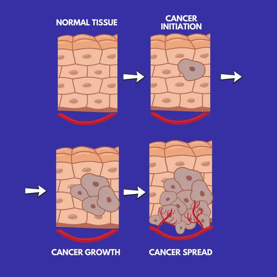 Cancer begins when a single cell in otherwise healthy tissue undergoes genetic and/or epigenetic changes that disrupt its normal growth control. Instead of stopping division or dying at the right time, the altered cell continues to multiply, gradually forming a small cluster of abnormal cells. As these cancer cells accumulate, they can stimulate the growth of new blood vessels (angiogenesis) to secure oxygen and nutrients. This ability not only allows the tumor to grow but also provides a pathway for cancer cells to enter the circulation and spread to other parts of the body.