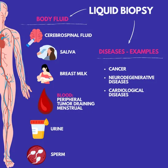 Liquid biopsy is an innovative diagnostic method that analyzes biological material present in body fluids - not only in blood, but also in cerebrospinal fluid, saliva, breast milk, urine, or sperm. Using advanced technologies, fragments of DNA, RNA, proteins, or even intact cells originating from tumors (and other diseases) can be detected. Liquid biopsy has applications beyond oncology, including neurodegenerative and cardiological diseases. Its key advantage lies in being not or minimally invasive and repeatable, allowing real-time monitoring of disease progression and treatment response.