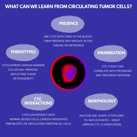 Circulating tumor cells (CTCs) provide a wealth of information about cancer biology. Their presence and number in the blood may indicate active disease or metastatic potential and often correlate with prognosis and treatment response. CTCs also display diverse phenotypes, reflecting tumor heterogeneity, and can interact with other blood cells, enhancing their survival and metastatic ability. Their morphological analysis - such as nuclear size, cell shape, or the cytoplasm-to-nucleus ratio – might improve CTCs classification. Altogether, CTCs serve not only as important biomarkers but also as a source of knowledge about tumor dynamics and spread.